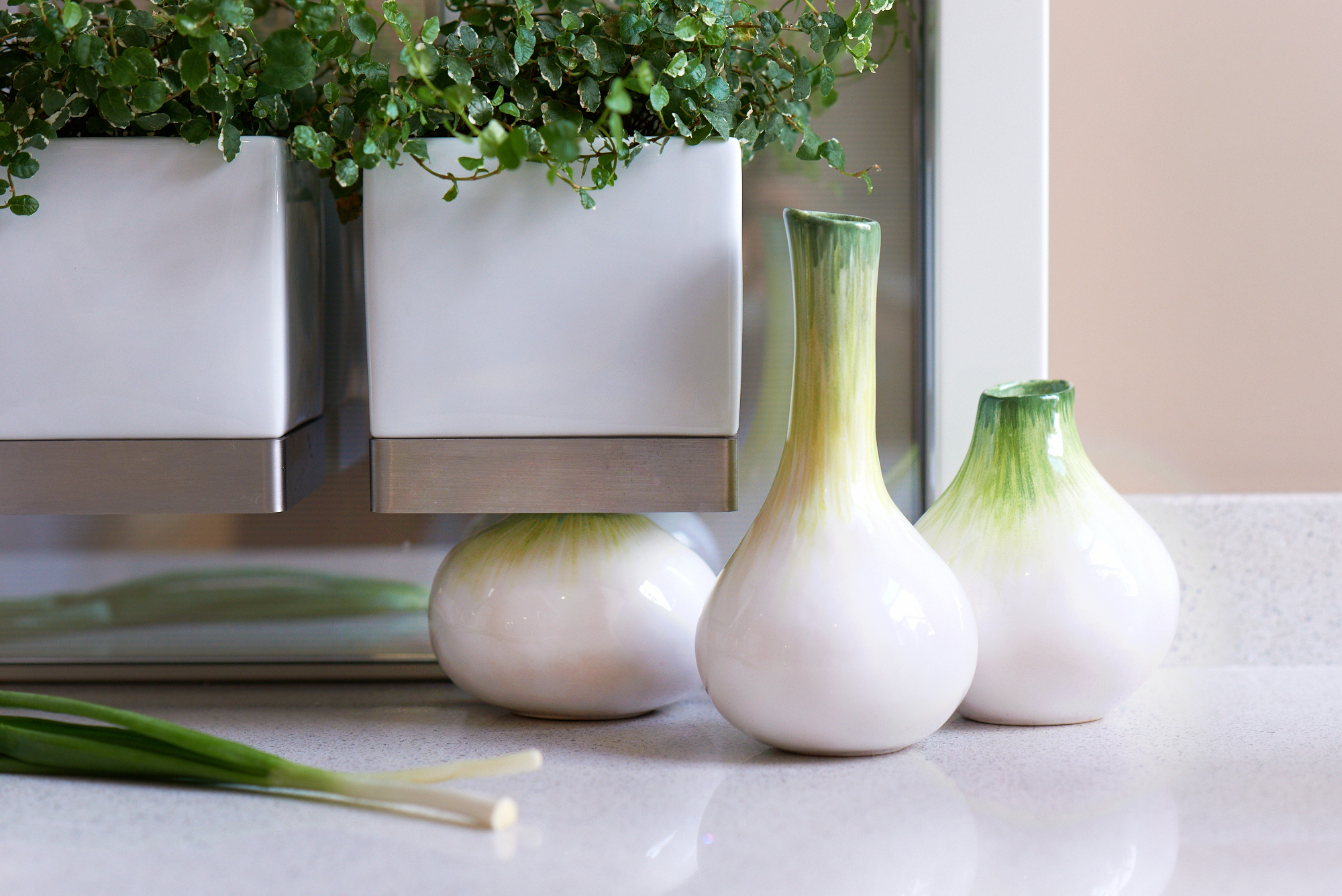 The idea of creating these vases came from observations of bulbous plants. Bulb is a symbol of life of the flower, but it is you who decides what type of flower this is for yourself. The natural silhouette of onions is charming in itself. It might look frozen and waiting for a miracle, intriguing or just sitting in the sun: any story that you make for this vase will work even when it does not have any flowers inserted. Just like the flower bulbs in a natural environment, decorative vases have different shapes and sizes. They look so much better having a pair or in a group. Vases made of ceramics, hand-painted and glaze. Materials: ceramics, glaze, hand-painting. Sizes: 24 cm × 11 cm, 16 × 12 cm, 9 cm × 13 cm.