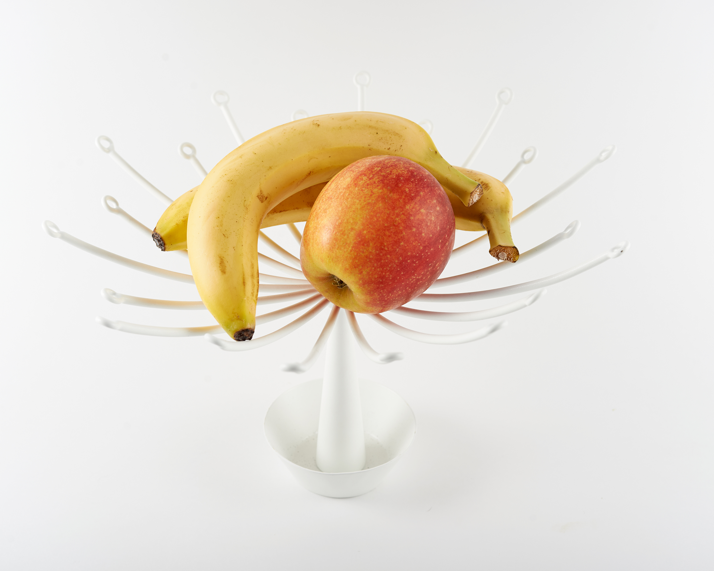 Vase for fruit, which resembles a dandelion. Fruit in this vase look as if they are floating in weightlessness. Materials: metal. Sizes: 30 cm × 20 cm.