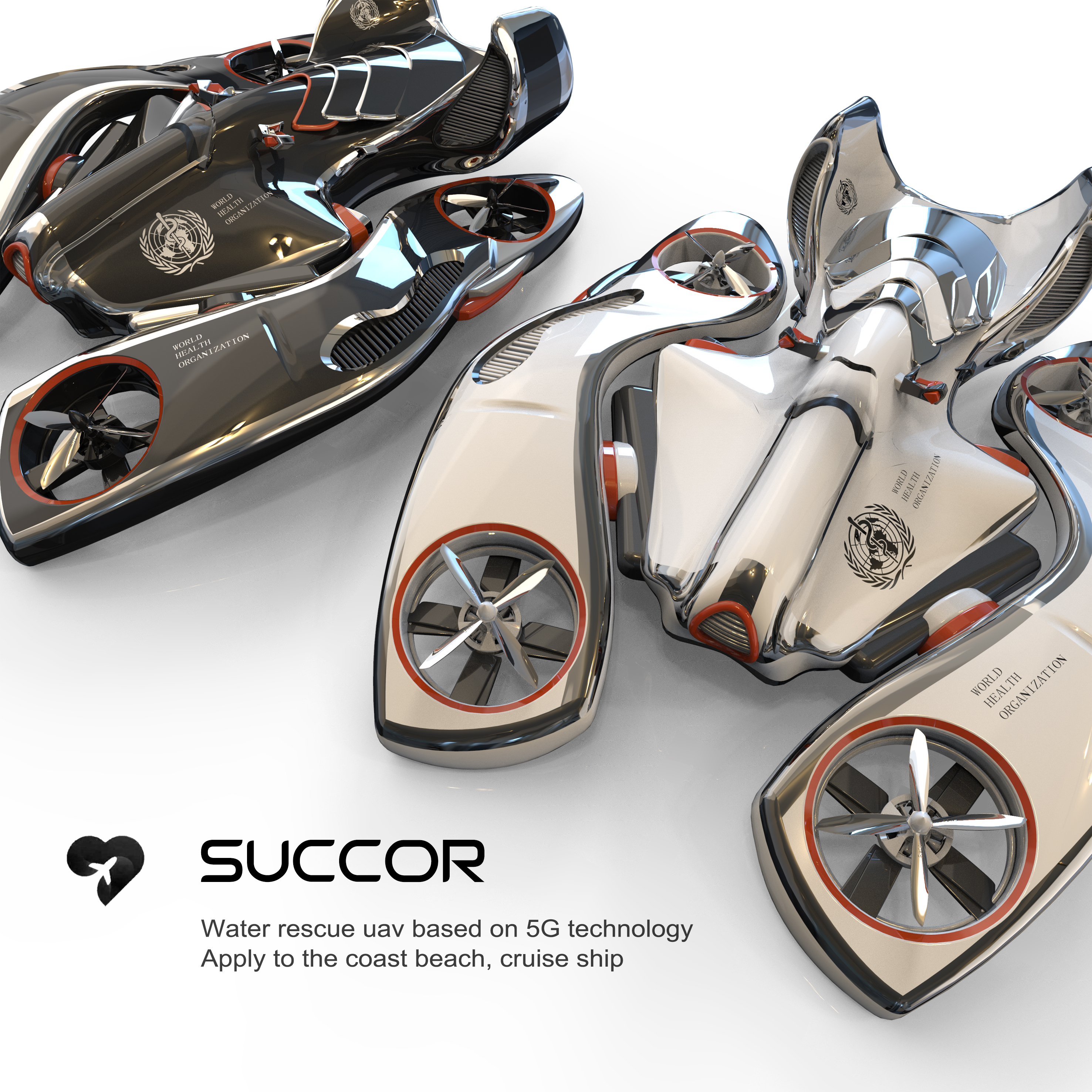 SUCCOR is based on the 5 g technology under water rescue uav design, adopting automatic uav transformation of the mode of lifeboat and the innovation of the wing of the adopted 90 ° rotating motor and front sensors and cameras, on either side of the fuselage with laser radar sensor used for navigation and researchers note, on the transmission and transport relief goods, rescue and improve the speed. With the help of 5G technology, the rescue efficiency of drones can be improved by about 40% through the Internet of things. It can also be used in large cruise ships to complete water rescue.