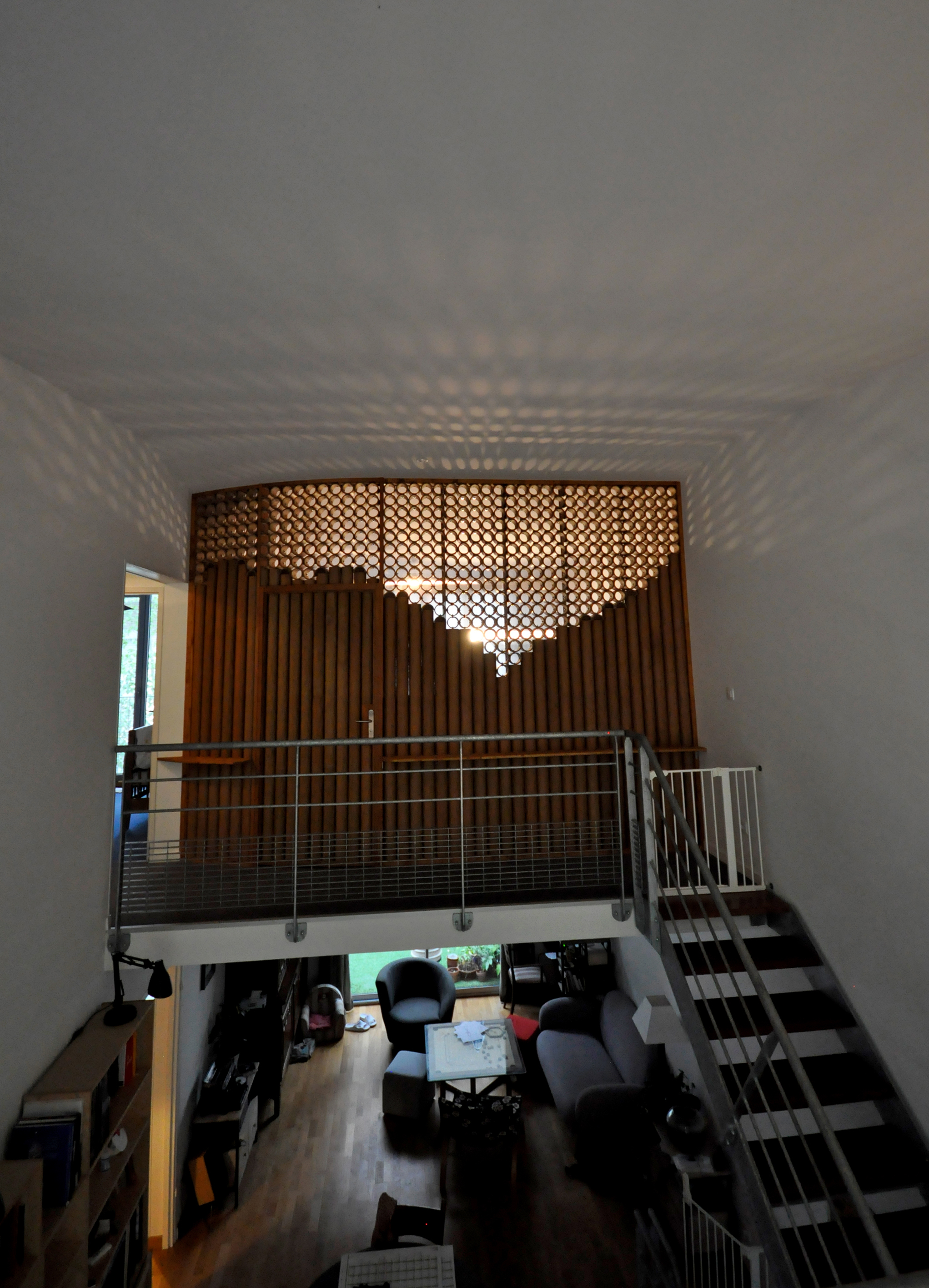Inside the Guillon Family home, a contemporary house situated on the island of Nantes, the central focus is the partition "Landscape" made from recycled cardboard tubes. The material was chosen for the softness of its texture and the concept of sustainable development. In this project, the cardboard tubes are either arranged vertically or placed on top of each other. The design allows the natural daylight or evening lighting penetrates through the grid and projects on the ceiling, which creates a play of shade and light. The Vertical composition of the tubes results in a landscape that leaves the impression of the soothing rays of the sun beaming from behind the silhouette of a mountain. Realization : 2013